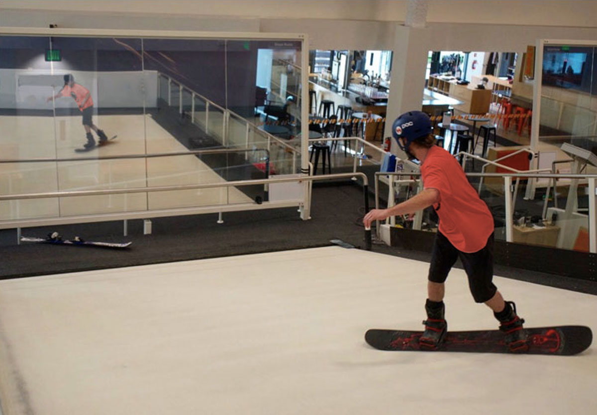 El simulador de ski-snowboard consiste en un sistema similar a una cinta de correr treadmill.